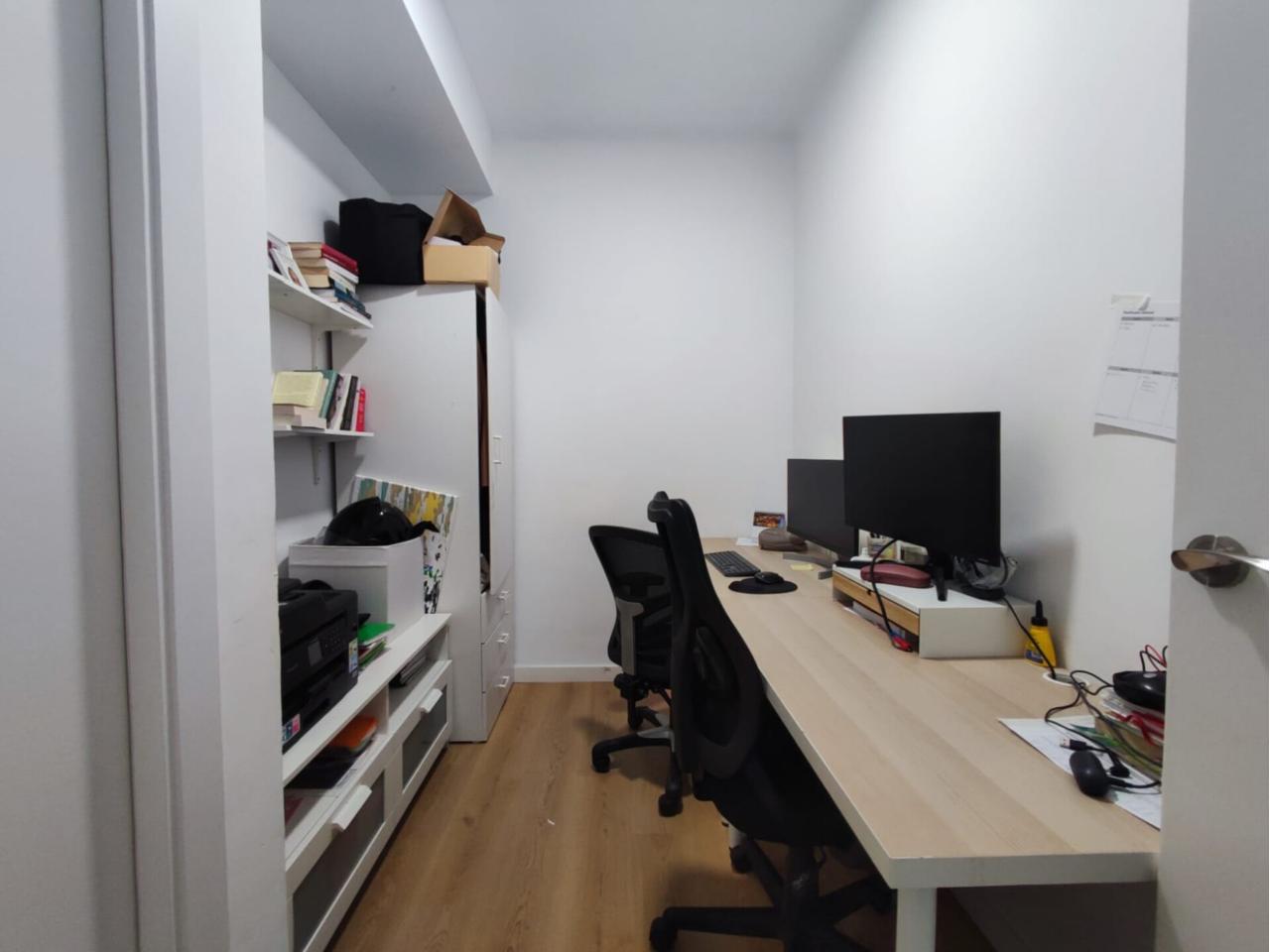 La vivienda se distribuye en salón-comedor con cocina abierta, tres dormitorios, un cuarto adicional ideal como despacho o sala polivalente, un baño completo, aseo de cortesía y lavadero independiente. Aunque no dispone de balcón, cuenta con grandes ventanales que aportan amplitud y una excelente entrada de luz natural gracias a su orientación sureste.